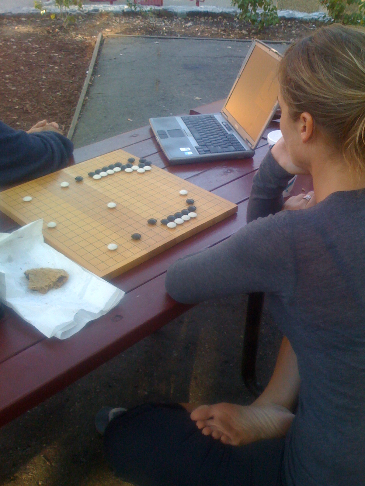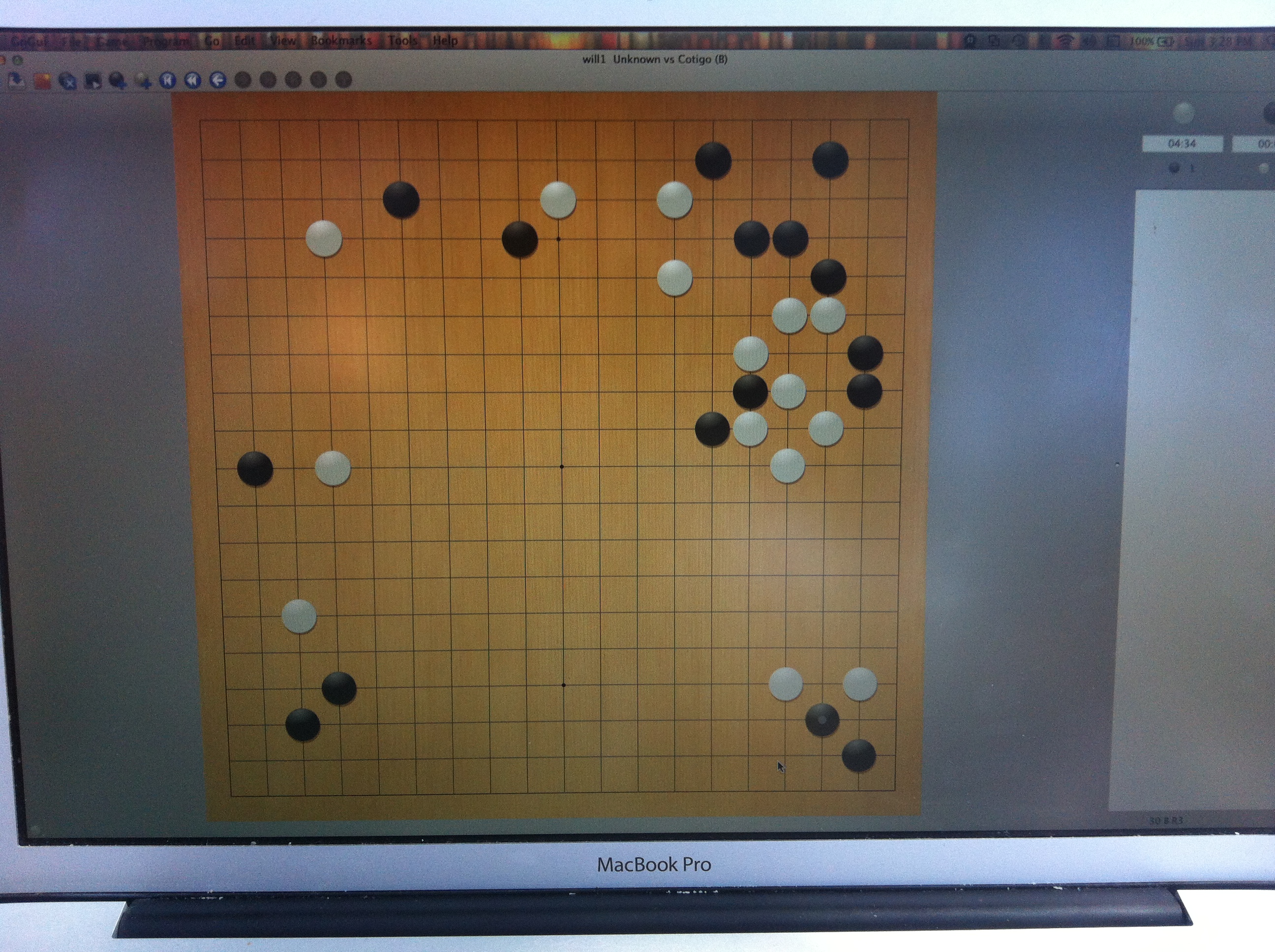 Since Scott's programs have been so pathetic compared to Will's skill, we have been reduced (for entertainment purposes) to making subgoals. Our usual one was wondering whether Scott's program would have any territory at all by the end of the game.