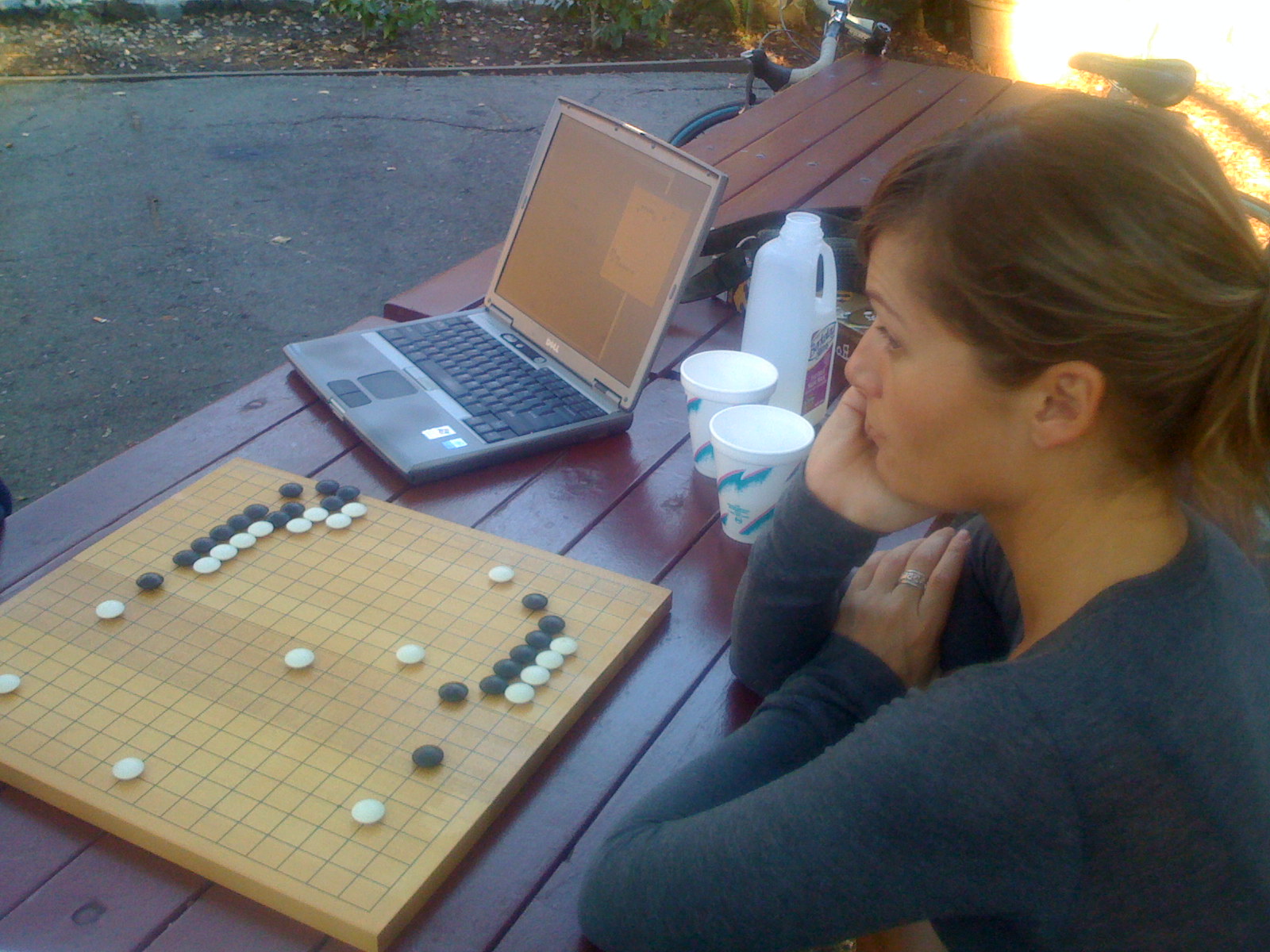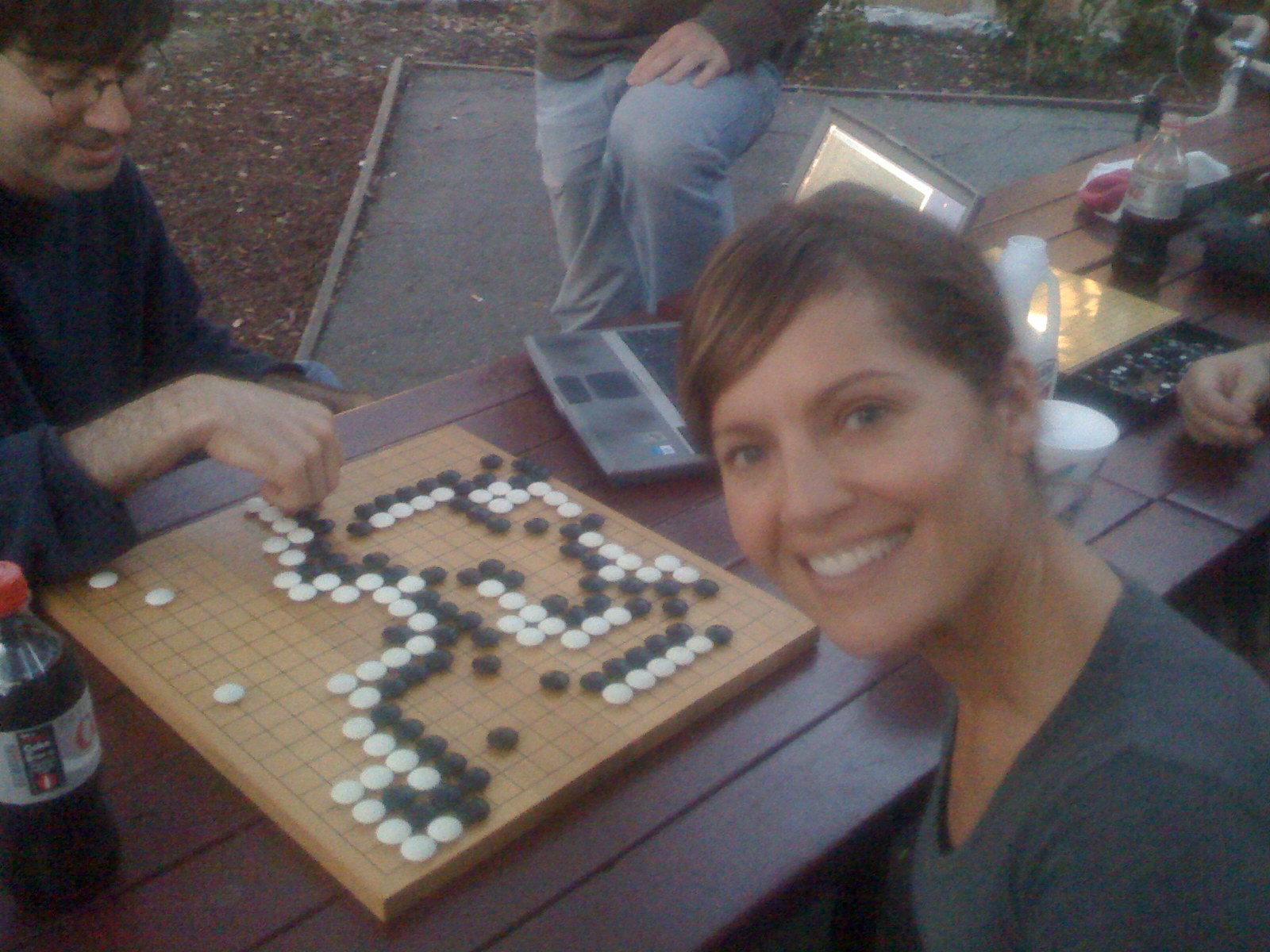 Will offered up his girlfriend Jill as the designated human champion. Jill had never played the game before a few months ago, and had only played about twenty games on a 9x9 board as practice. This was the very first game of her life on a 19x19 board. Scott was thrilled to offer his computer the best chance at a victory since the bet began five years earlier. (The game itself wound up being one of the most even and interesting in the history of the bet.)
