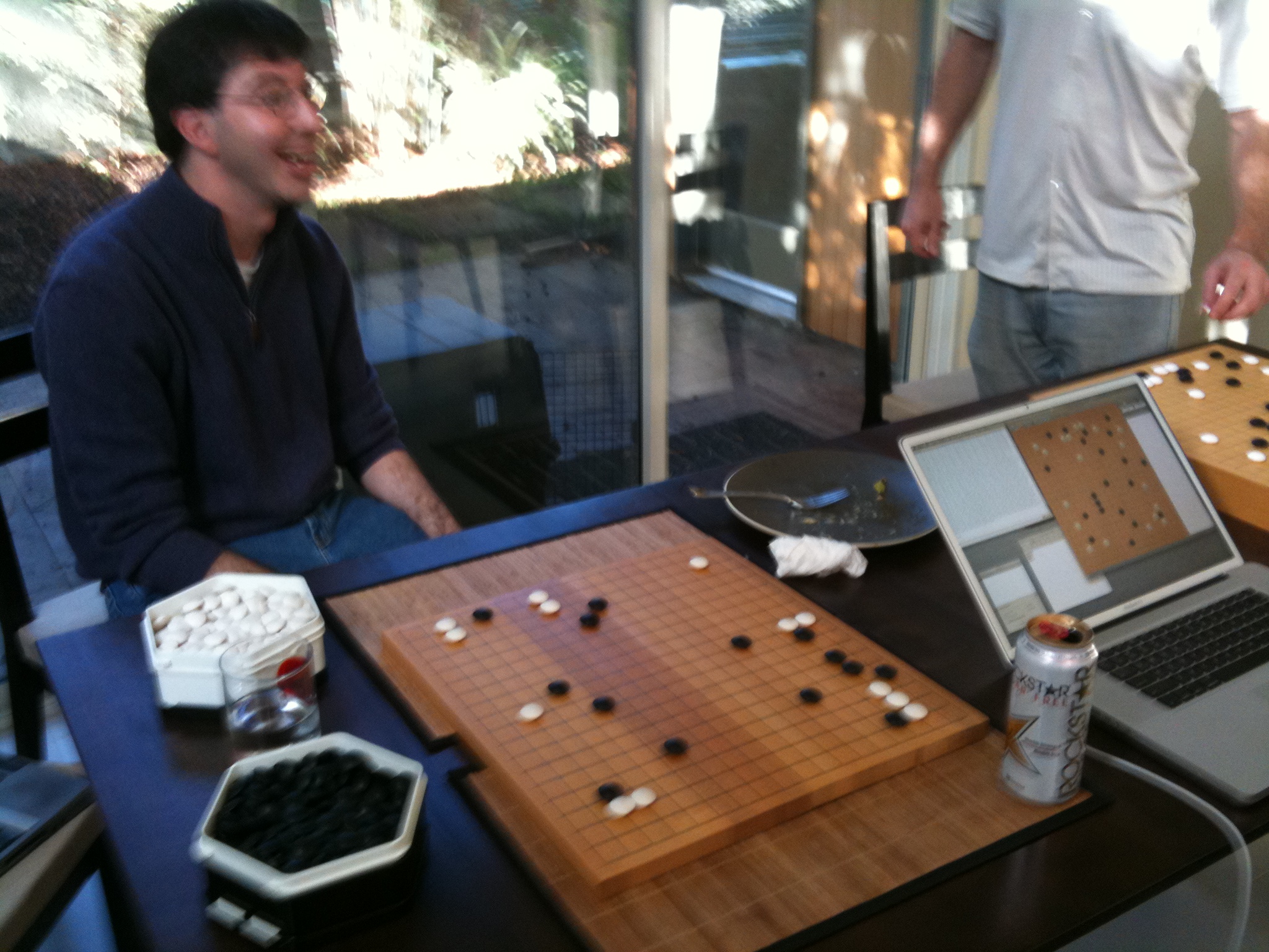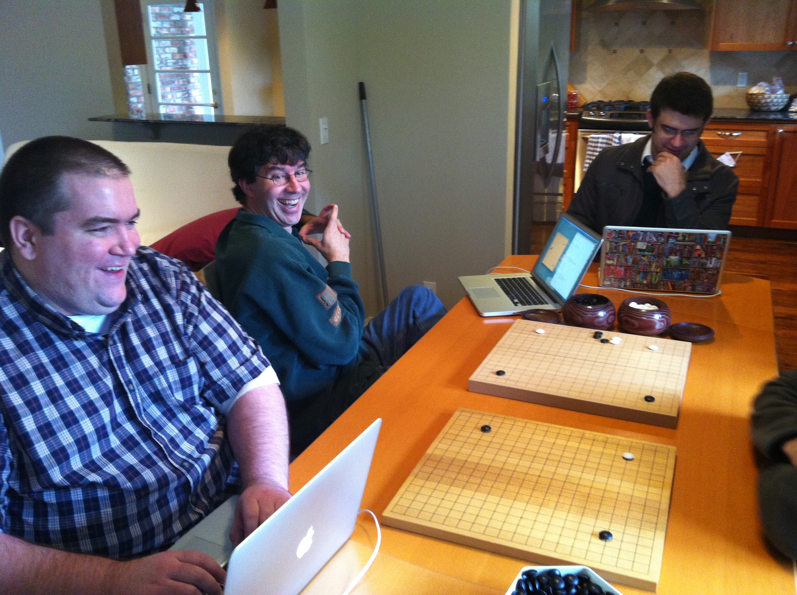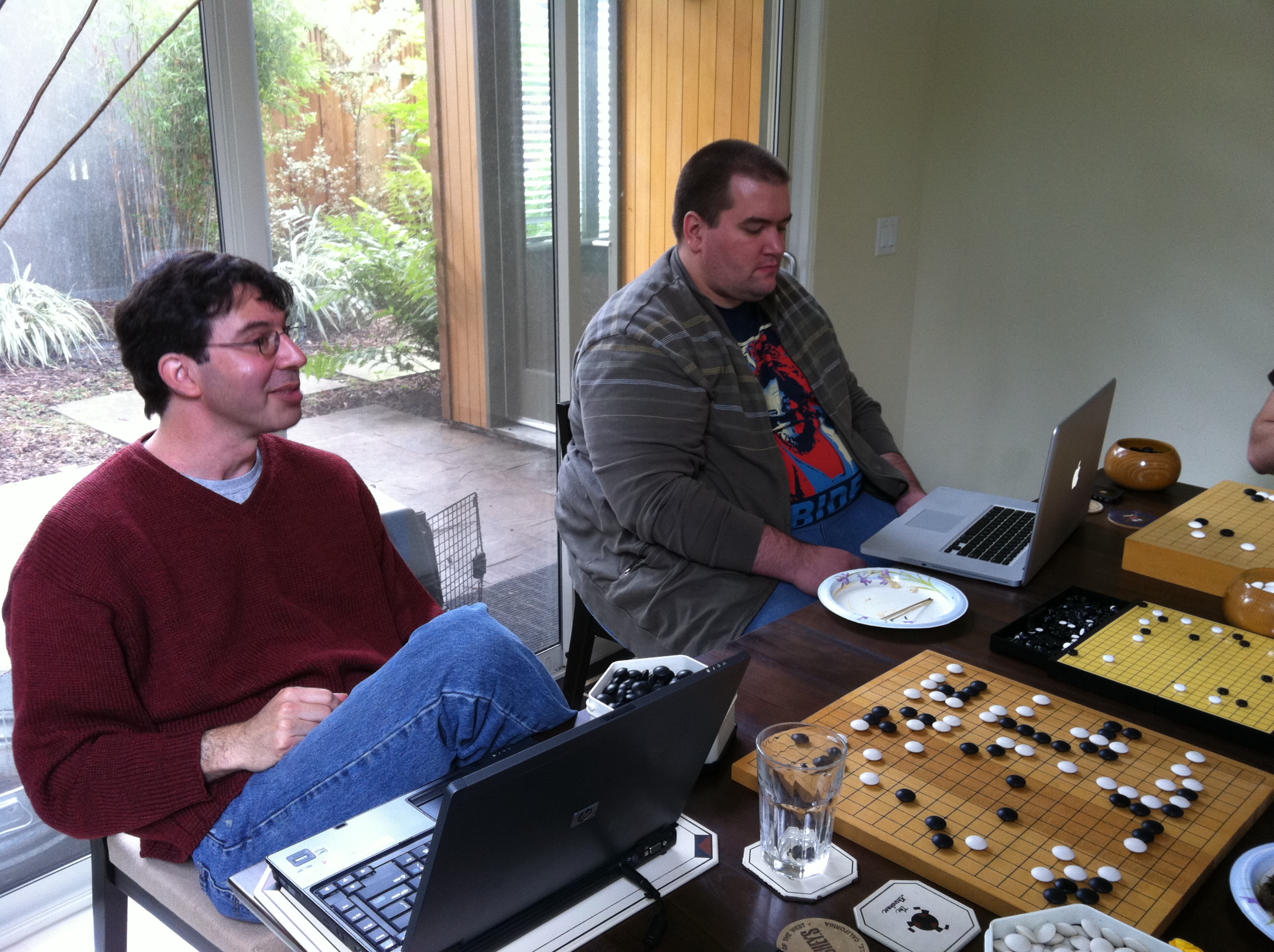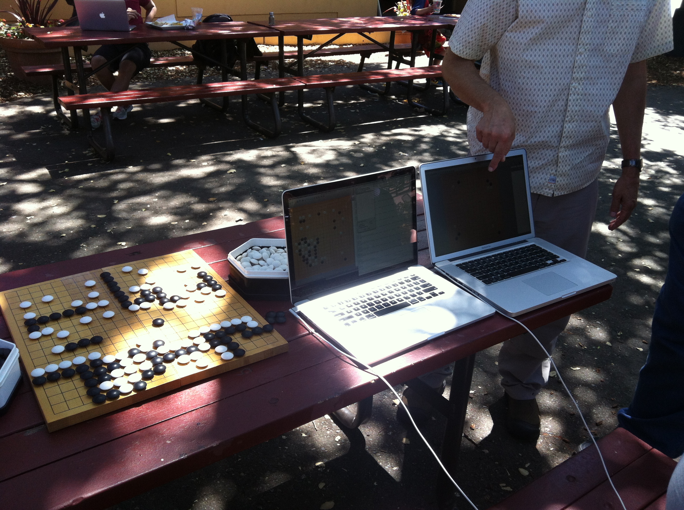 Joe had nothing, when the day started. He began programming, as the other two games started. Halfway through, he announced: "I downloaded a Go GUI. You can see the board, but it won't make a move." By the end of the match, Joe successfully implemented a random player, hooked up to the GUI.
