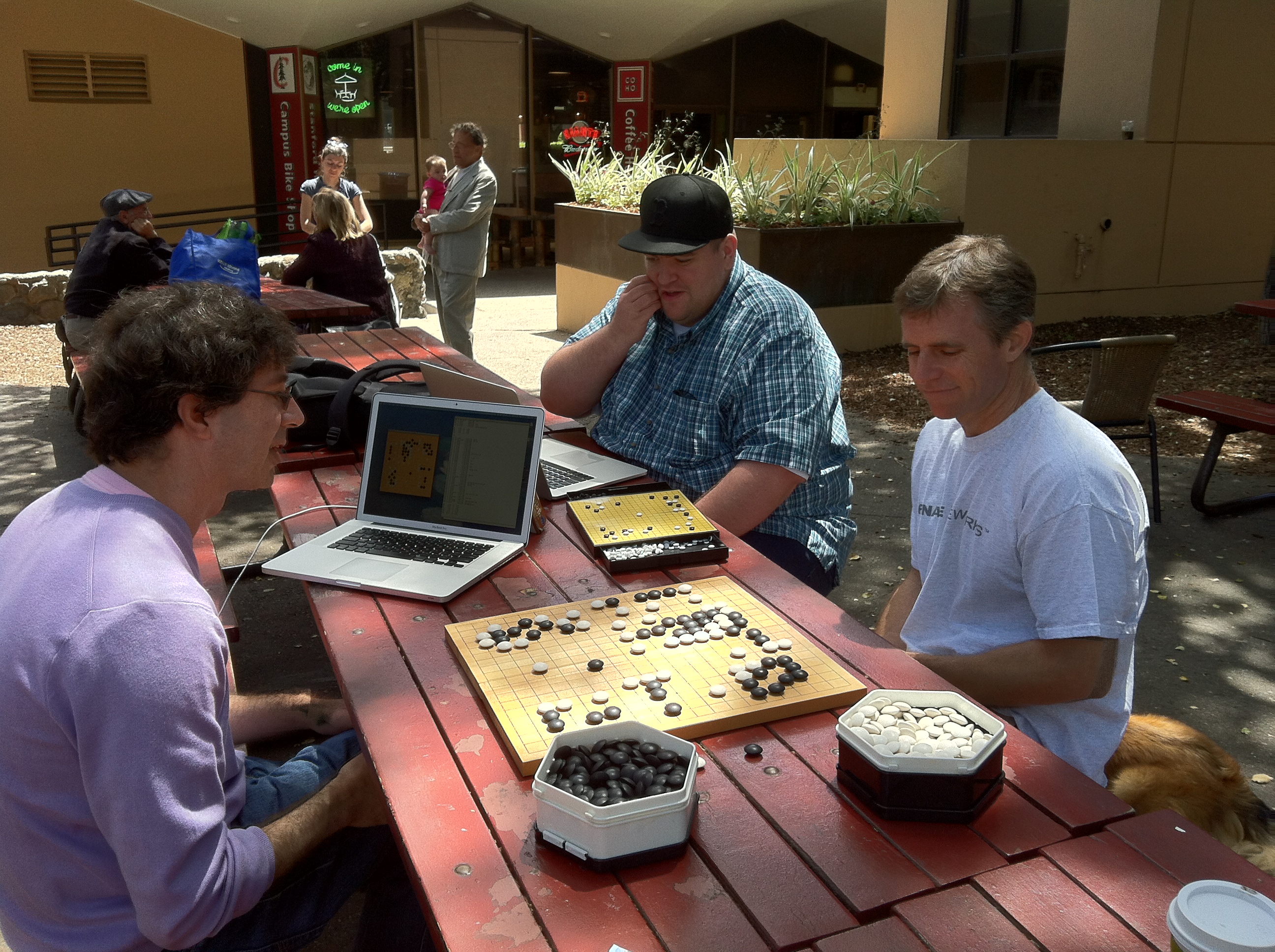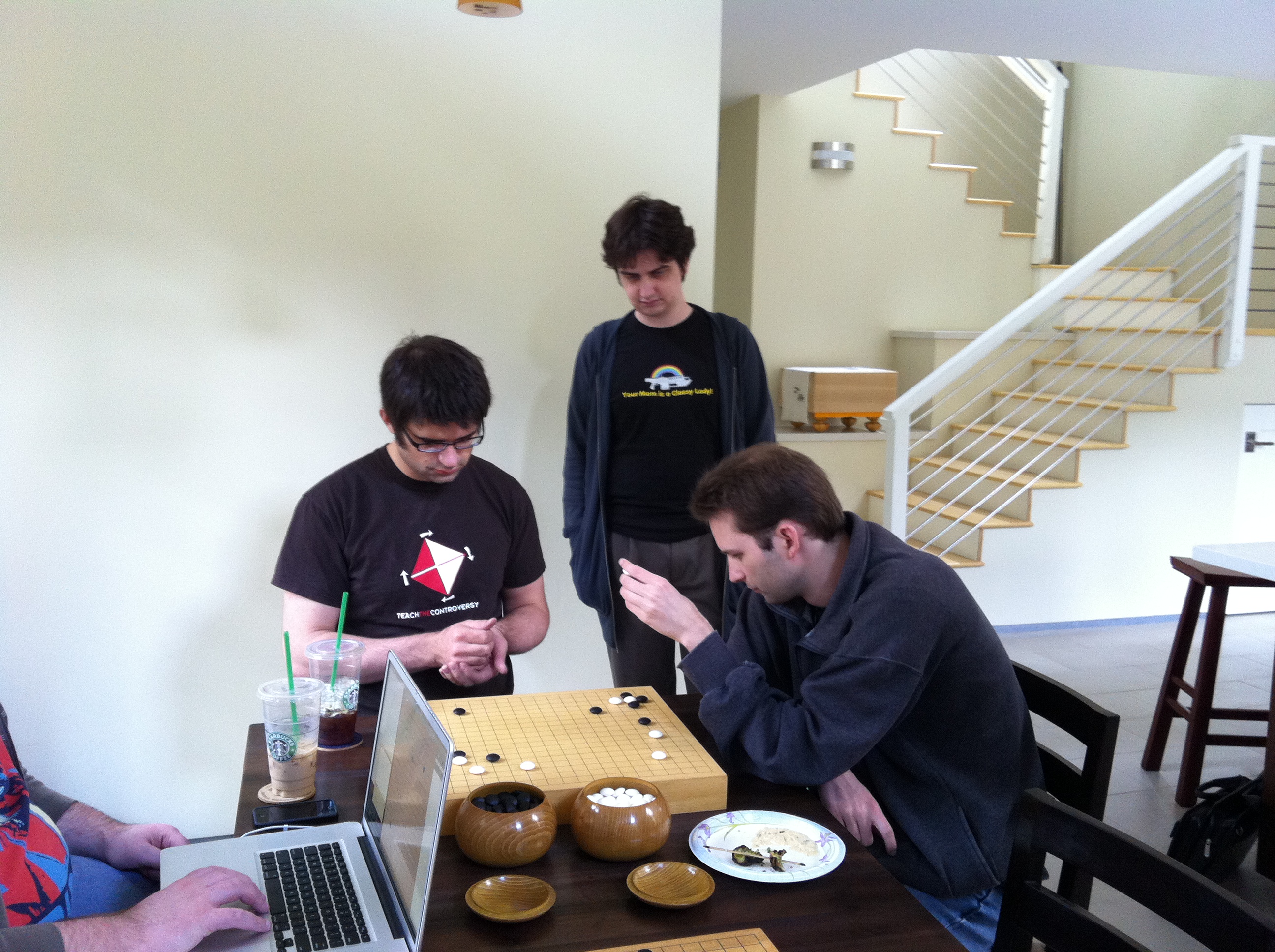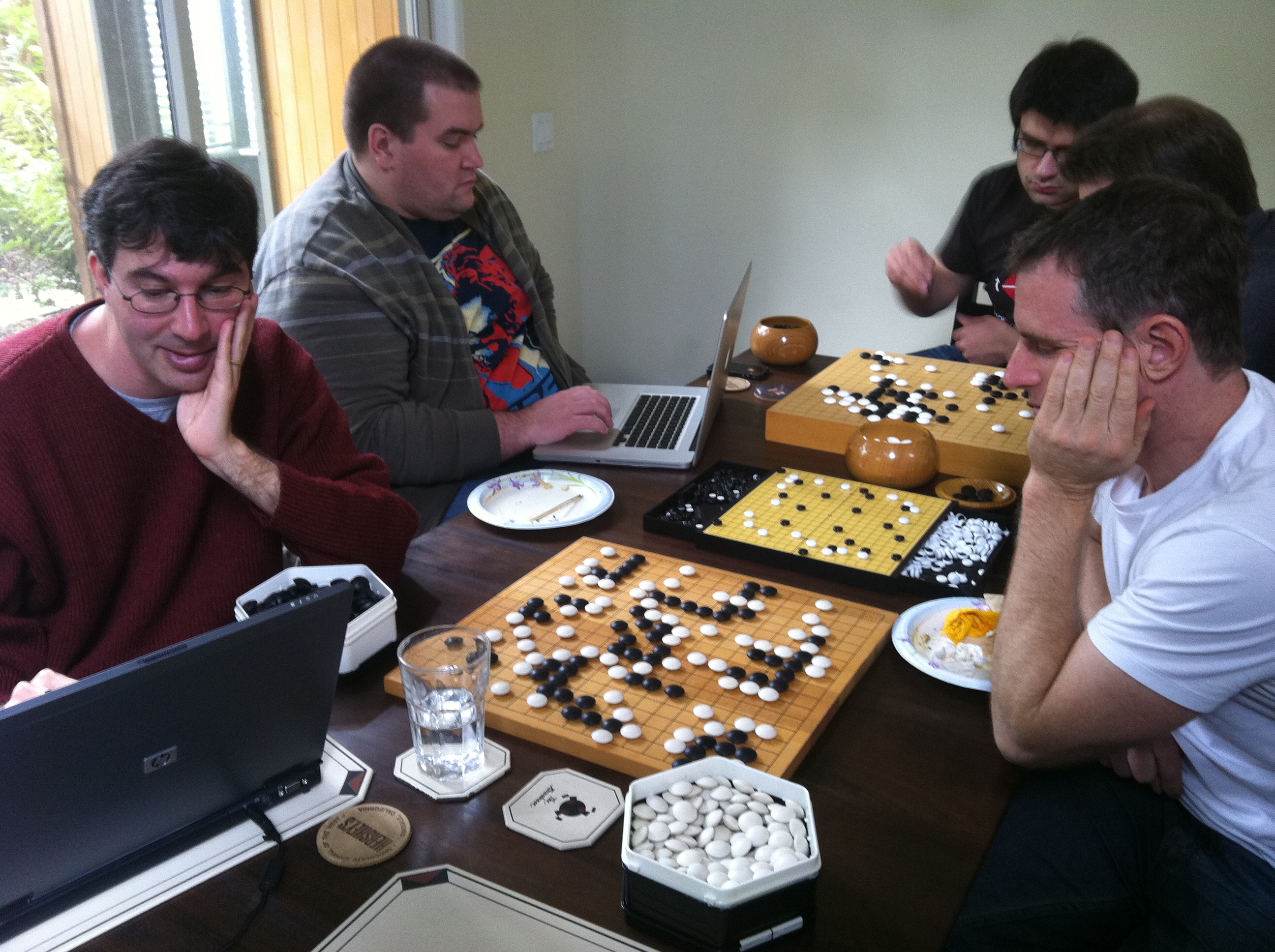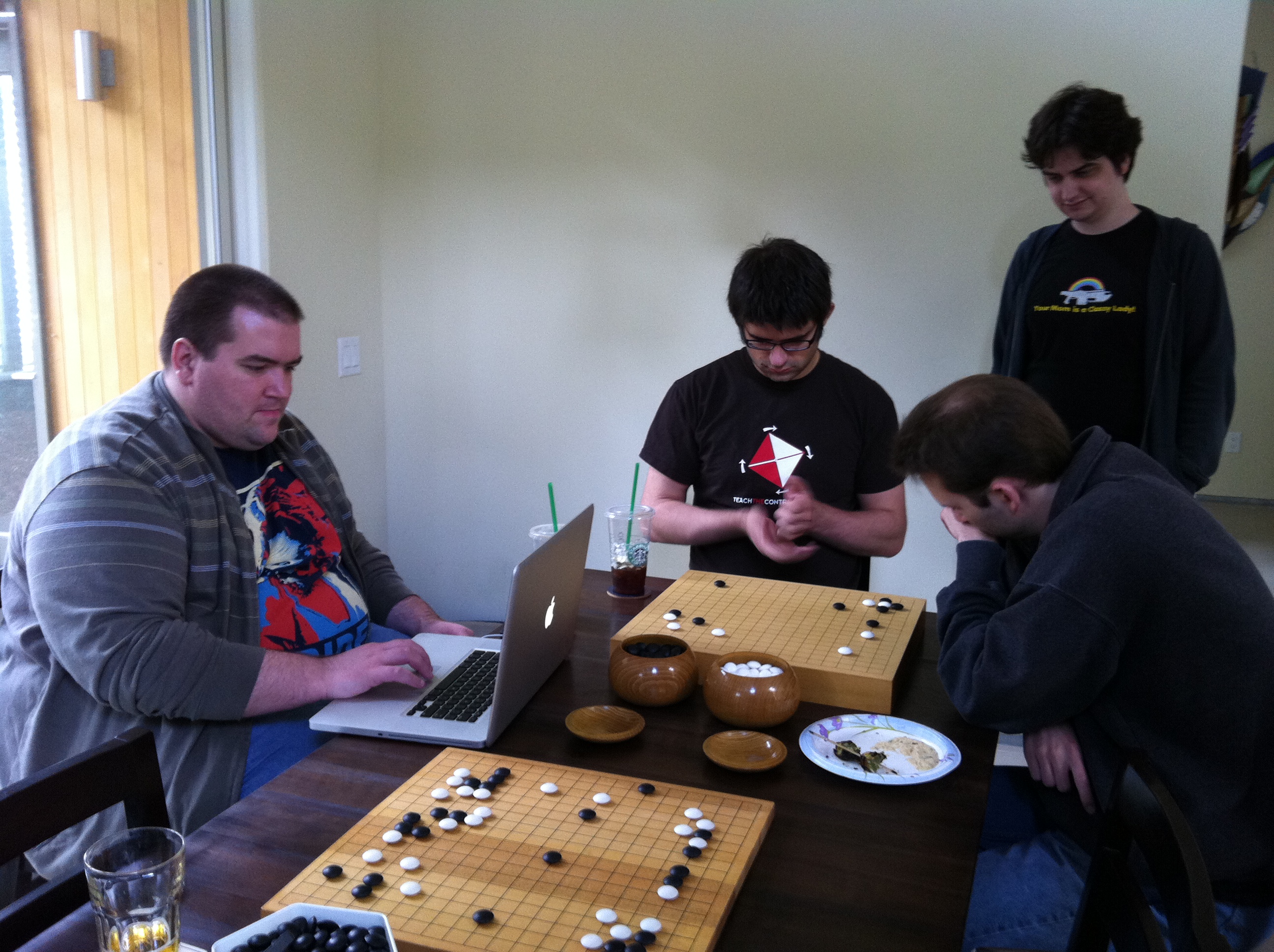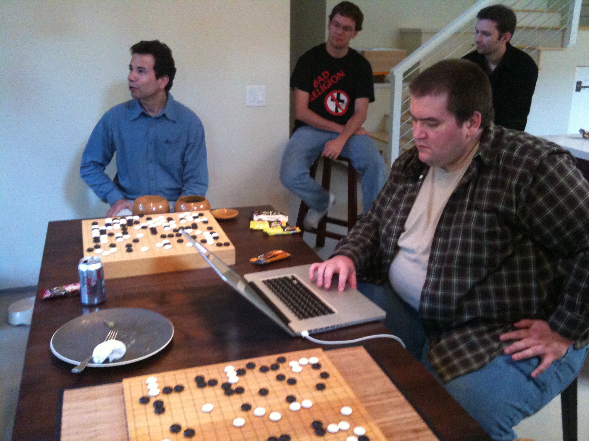 Joe had nothing, when the day started. He began programming, as the other two games started. Halfway through, he announced: "I downloaded a Go GUI. You can see the board, but it won't make a move." By the end of the match, Joe successfully implemented a random player, hooked up to the GUI.