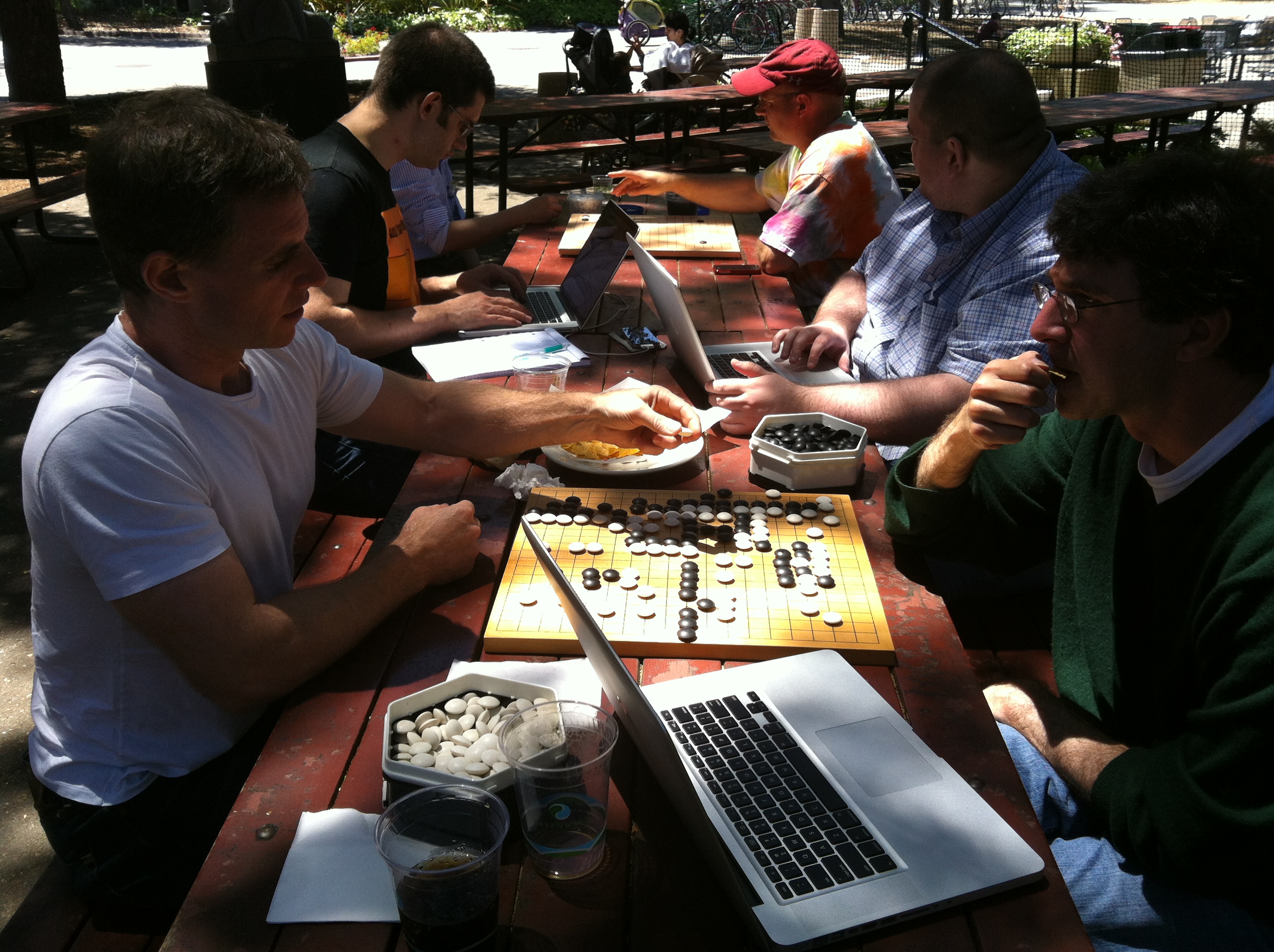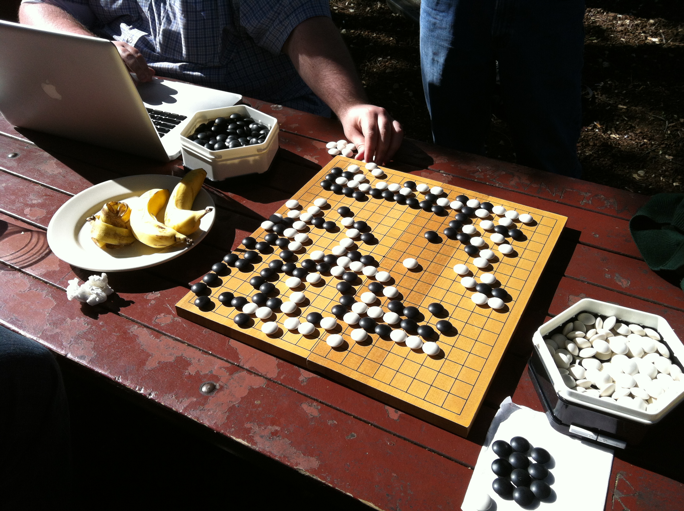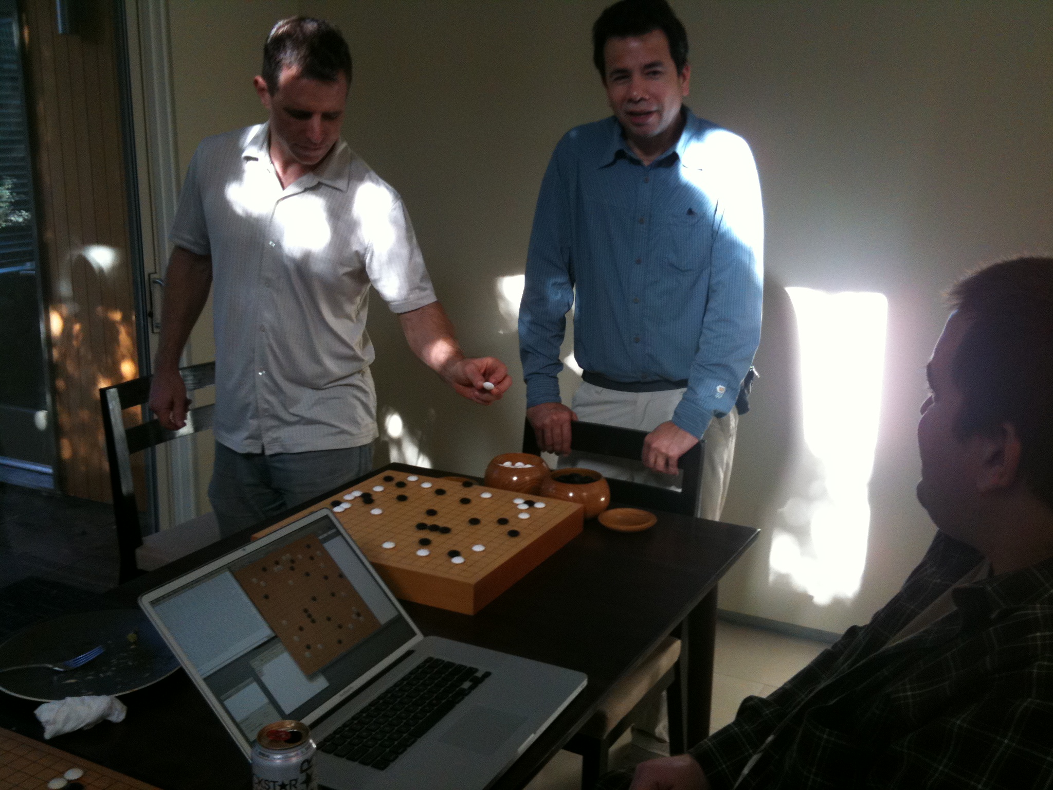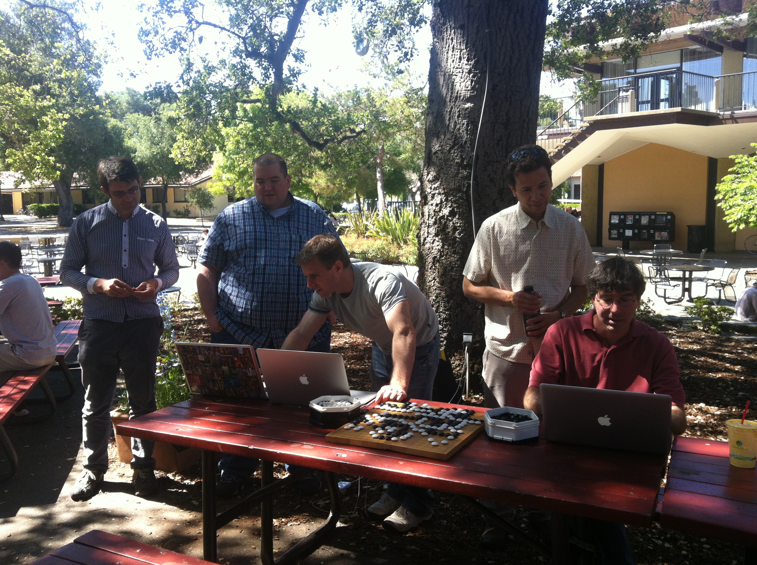 Joe had nothing, when the day started. He began programming, as the other two games started. Halfway through, he announced: "I downloaded a Go GUI. You can see the board, but it won't make a move." By the end of the match, Joe successfully implemented a random player, hooked up to the GUI.