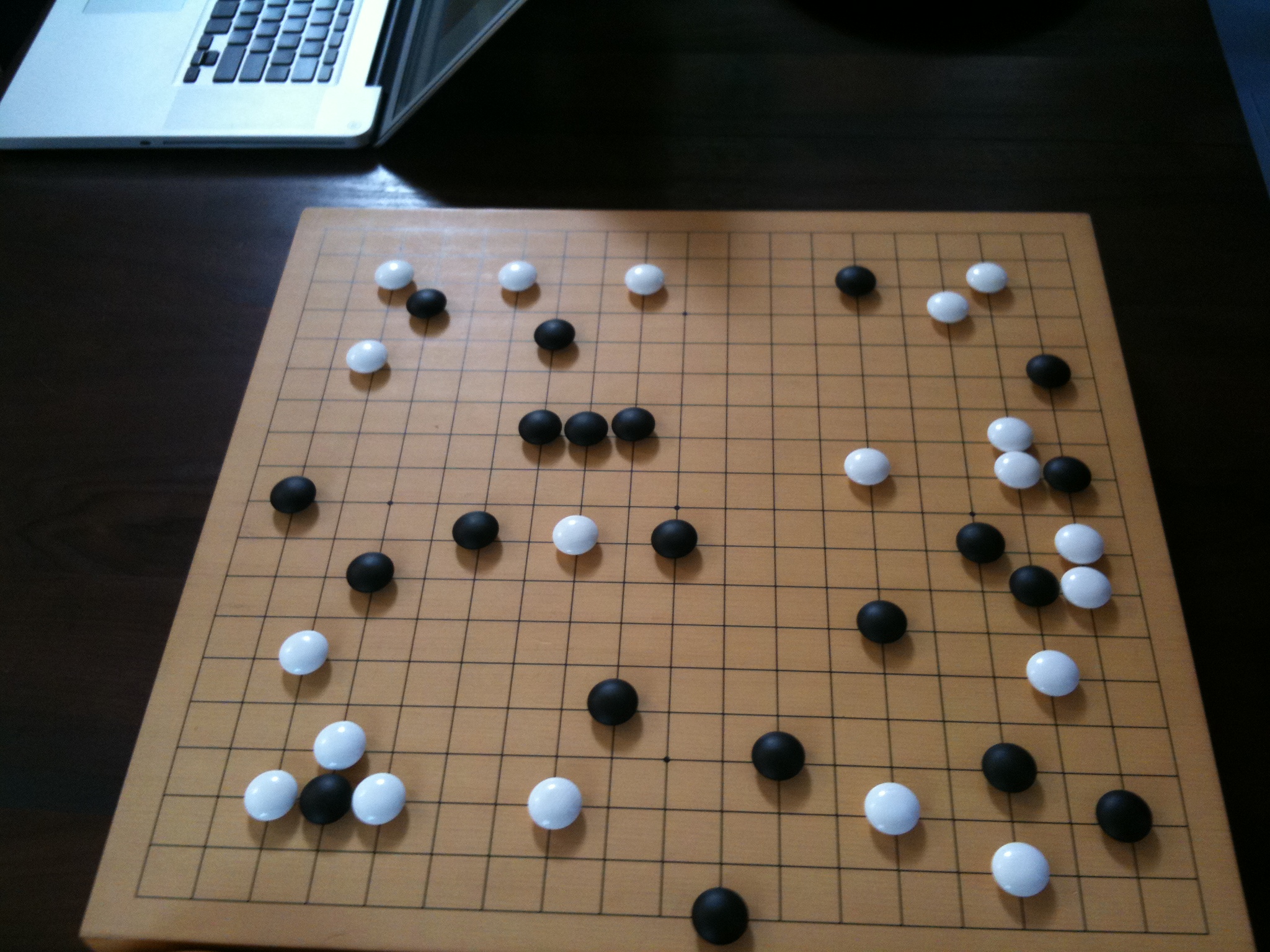 End game: It looked like black (Scott's program) filled up all liberties in one large section with only one eye ... but it managed to escape and make a second eye.