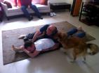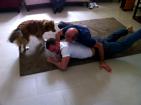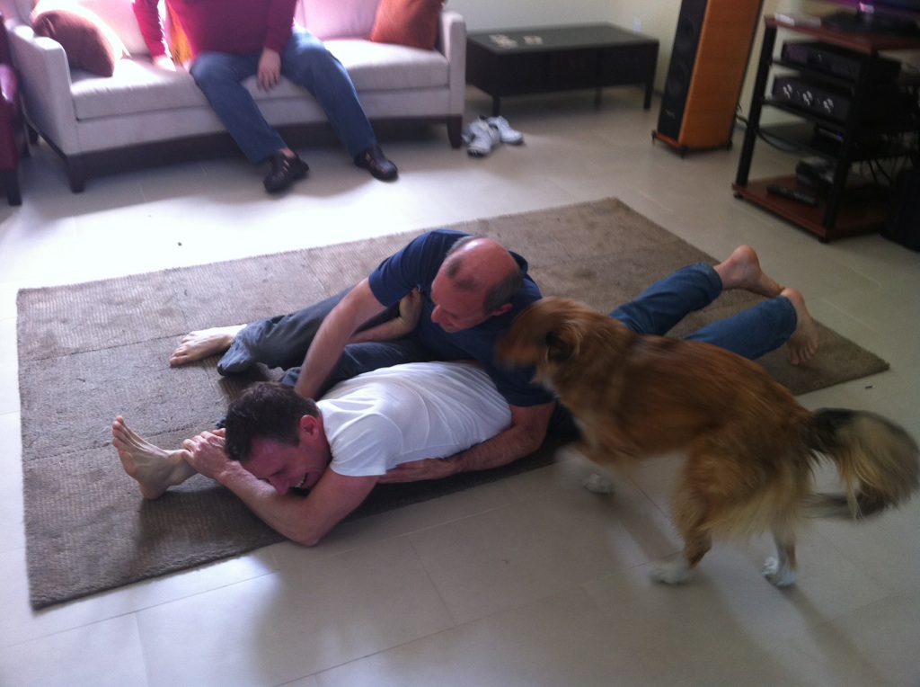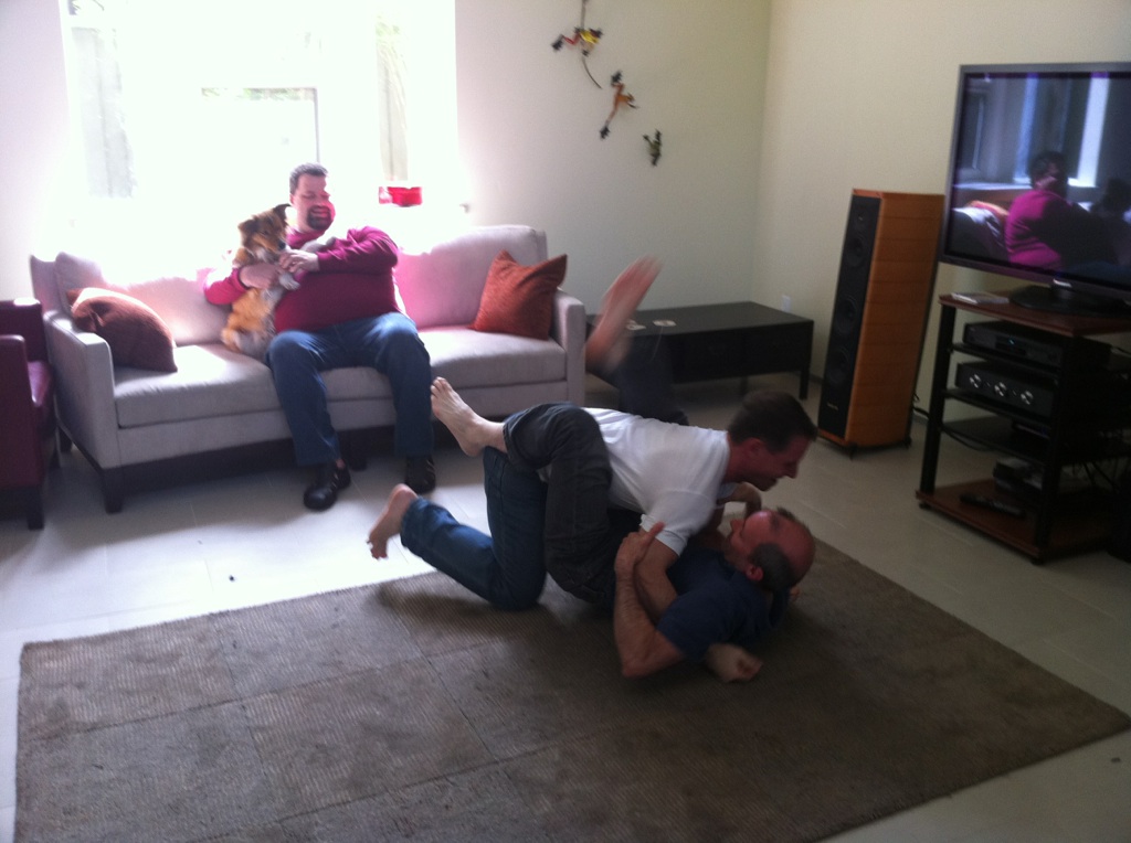 Separately, Will suggested a new bet with Don: physical submission grappling until one participant gives up. Will is about 175 lbs; Don about 145 lbs. However, Don has trained in martial arts for more than 20 years and holds a black belt in Brazilian Jiu-Jitsu, while Will only has some brief instruction in karate. Will agreed to risk $1, on 100:1 odds, that he could defeat Don. He attempted twice, and lost both matches. First match: Don feels out the takedown, pulls guard, gets full guard, transitions to omoplata, Will powers out by straightening his arm, Don (now on top) transitions to a rear naked choke, Will taps. Second match: Don remains standing, lots of back-and-forth arm pummeling for position, Don eventually gets double underhooks/bearhug, more jockeying for balance, finally Don gets an outside leg trip takedown (like Royce vs. Gordeau in UFC 1), and winds up straight into mount position on the ground; Will taps from position (no submission).