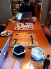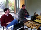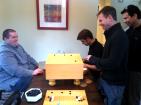 Scott spent a lot of time "thinking", but no time "coding". As the program hadn't changed, he forfeited the match. Meanwhile, Will has been training regularly with a professional Go tutor, and believes himself to be about 10 kyu. Scott only plays at our biannual Go challenges. Will said he would "easily" beat Scott in a straight up game. Will wound up losing to Scott, 44 1/2 (39 + 5 1/2 komi) to 53.