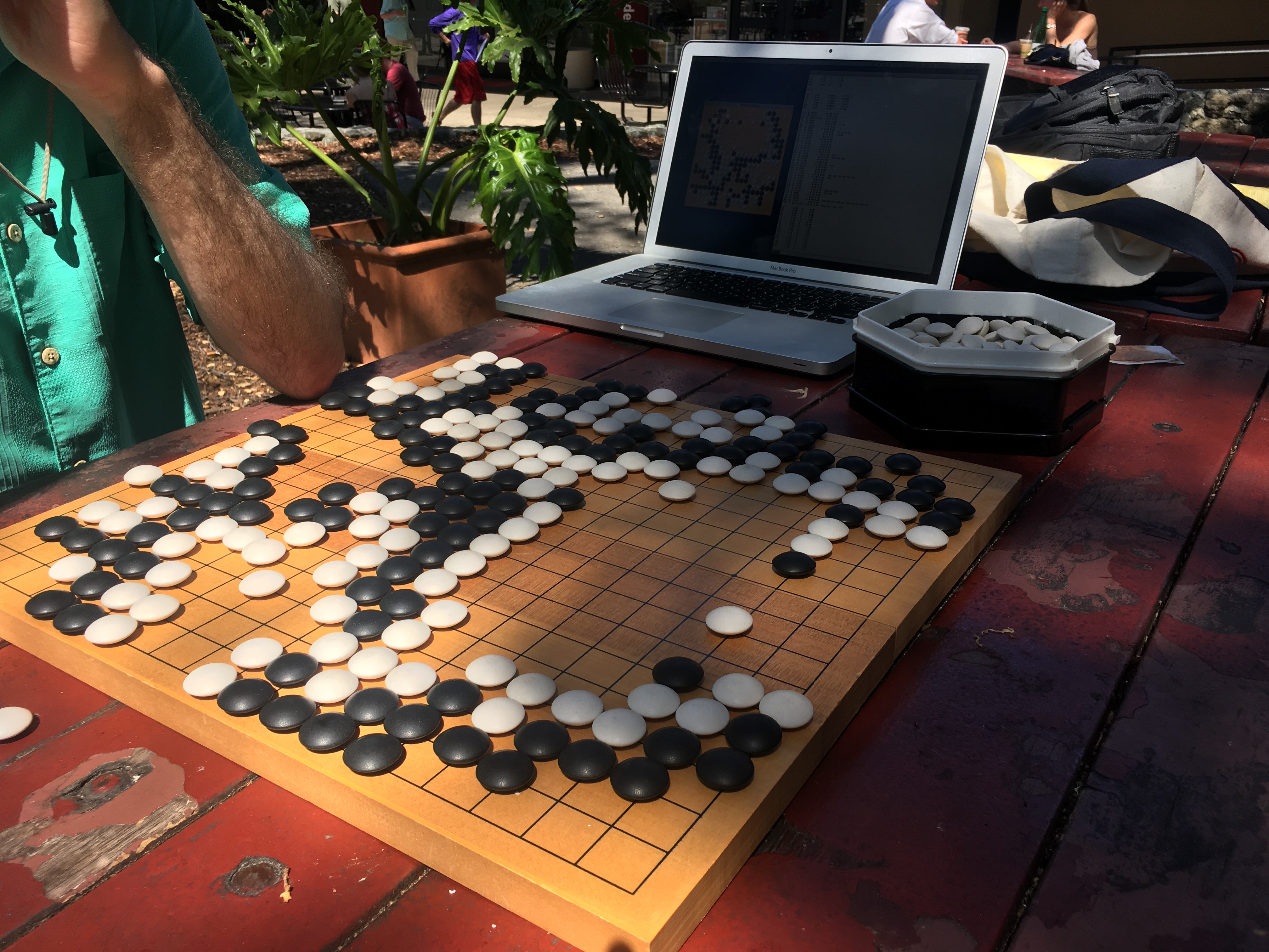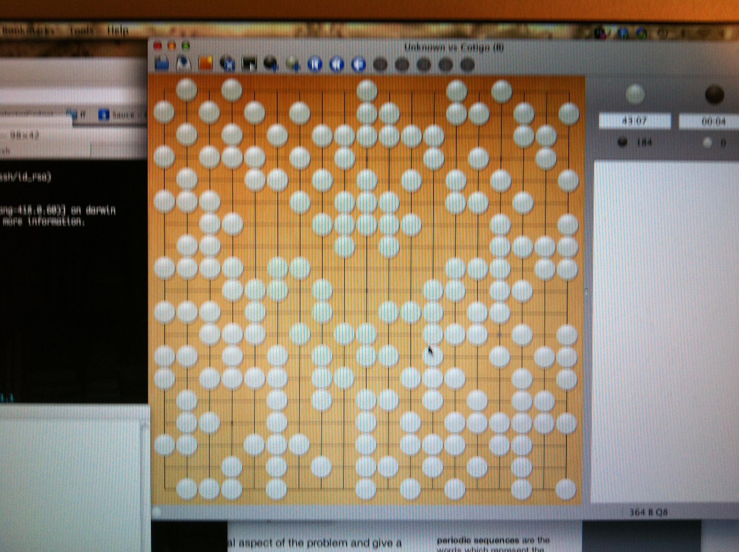 Joe: "Makes a move in a few microseconds, and then sleeps for 30-200 seconds, to pretend that it was thinking." The move choice was by "copying a move from the most similar master level game it could find", where similiar is "defined badly but for quick lookup". In the mid-game, from Will: "This is like popping bubble wrap." Joe's program captured a stone, so he got one point; Will got the whole board.