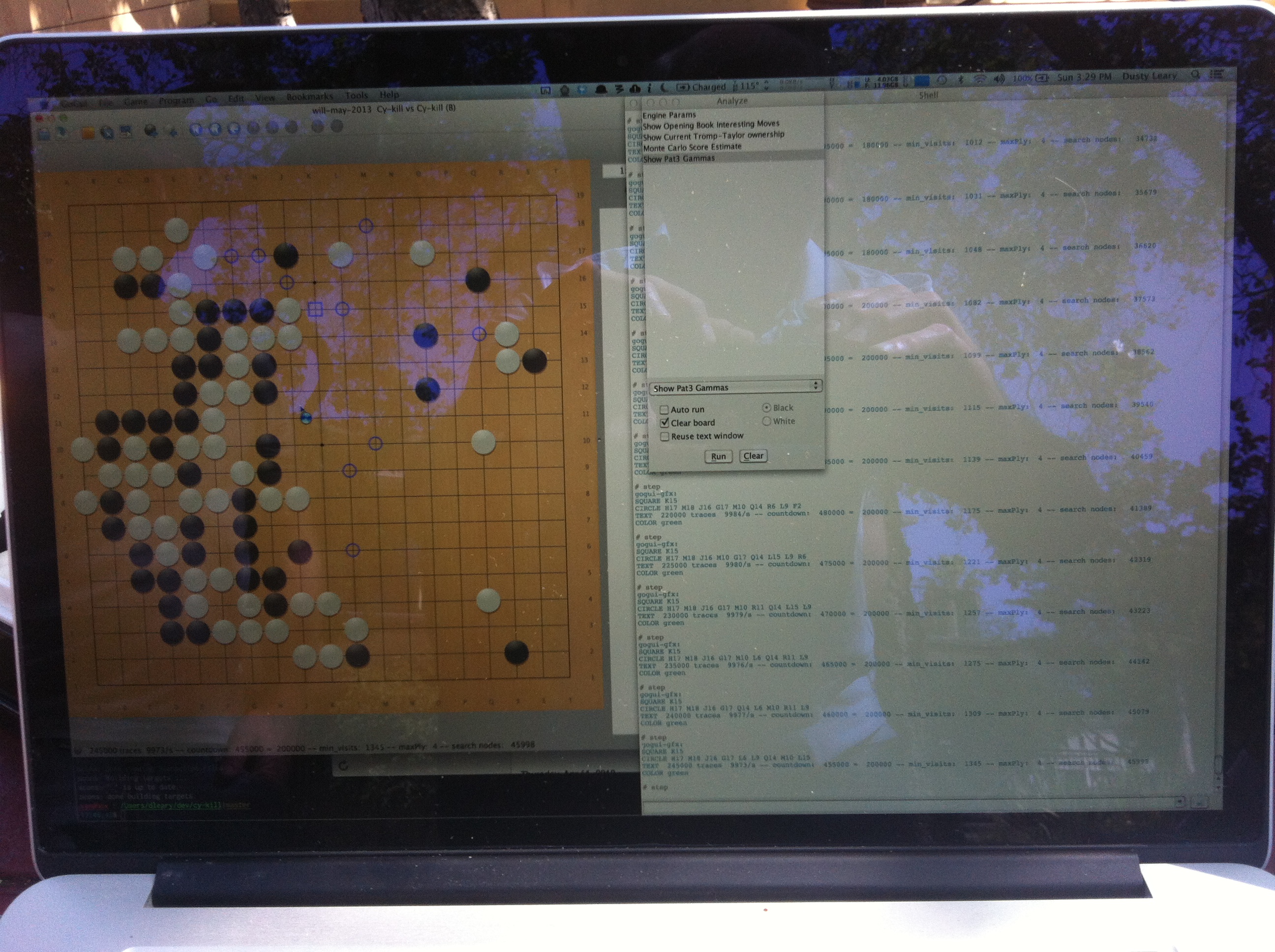 Question to Dusty: "Your program had some bugs last time. Have you fixed the bugs?" Dusty: "I made a lot of changes. It's a whole new program." Dusty's program was not running on the Amazon servers this time, but instead his new MacBook (16GB RAM, retina display). Dusty added "open book knowledge trained off downloaded games" (both whole board and section matching), and moved from a 1 CPU implementation, to multicore.