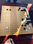 As this match began, Will said that the usual no-territory subgoal was no longer interesting enough to him. He wanted to try a different handicap. He decided that he would make every other move "blindfolded". This isn't quite random, as he could place a stone in the rough area that he wished. Still, it made the game, and even the strategy, quite interesting. For example, many obvious typical Go situations (such as whether a group of stones is alive or dead) assume that you can make the correct countermove any time your opponent makes a move. It's quite a bit harder if your every-other move might not go exactly where you wish.