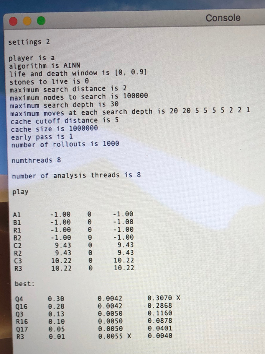 What does the neural net do? (1) who is winning?, (2) what is best move?, (3) what is best guess about what final game board will look like? Neural net has been improving in the past year, by playing itself. Working on self-training, haven't quite worked that out.