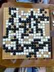 Dusty resigned, with no final score, but remarked: "I think it will always be hard to judge relative strength of my bot based on score, because it prefers to play bad moves that 'might' win rather than good moves that don't change the fact that it's losing, but prevent it from losing by 'less'."