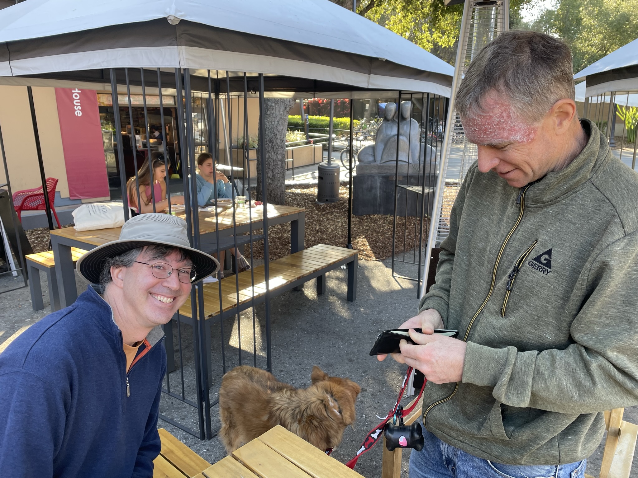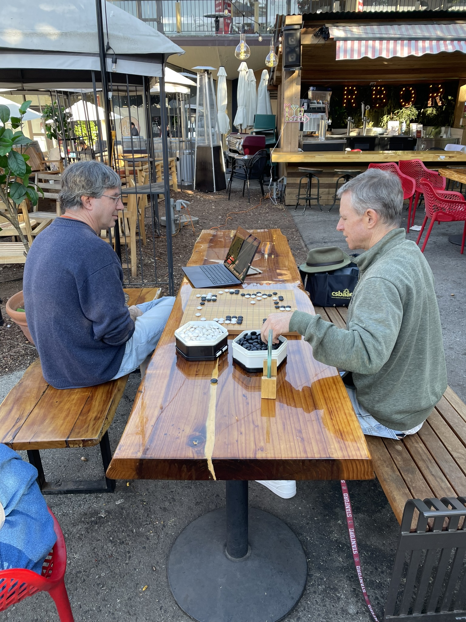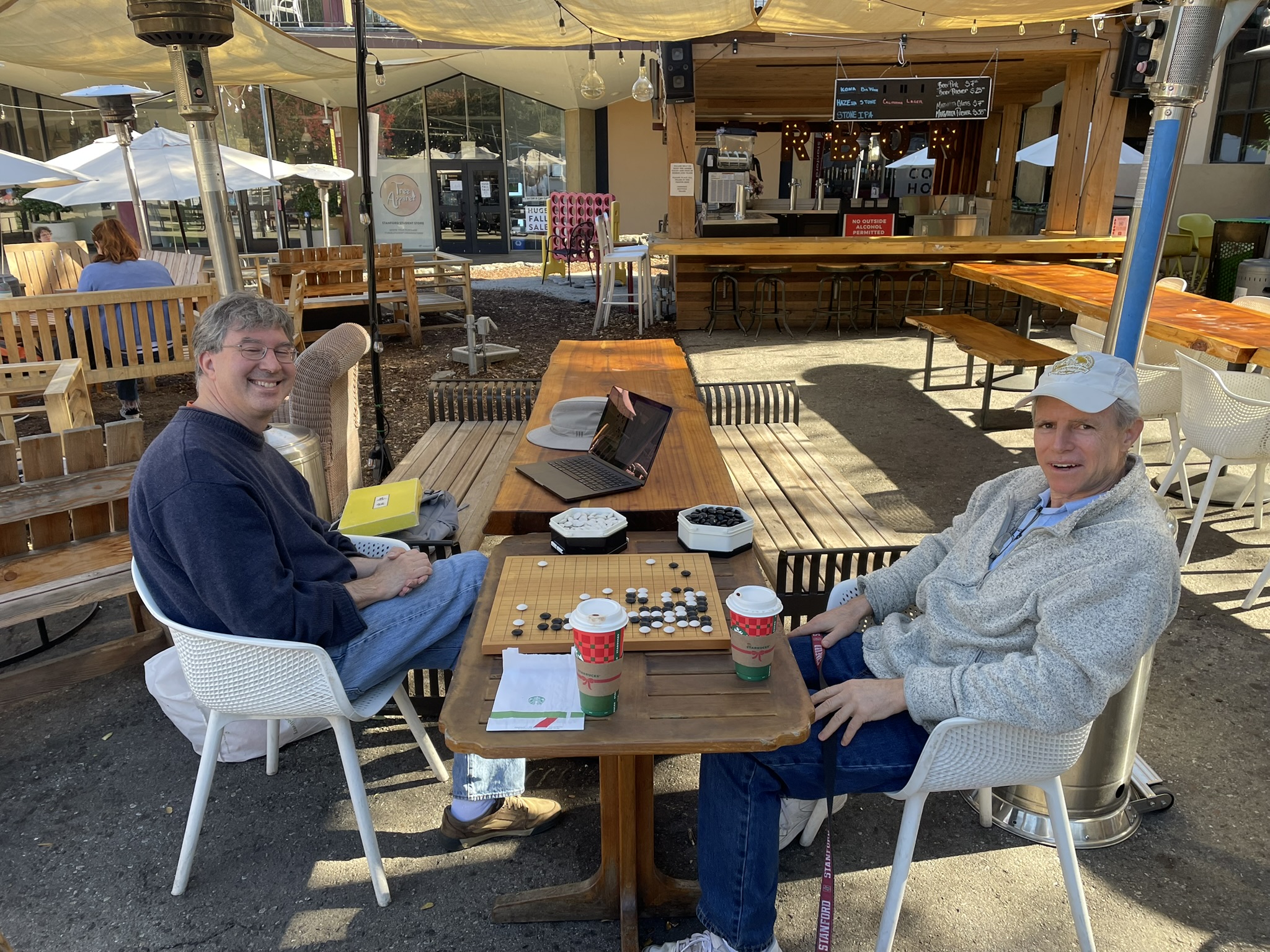 It was a wet & rainy afternoon. Will presented Scott with a gift (see first photo): the book "Deep Learning and the Game of Go".
