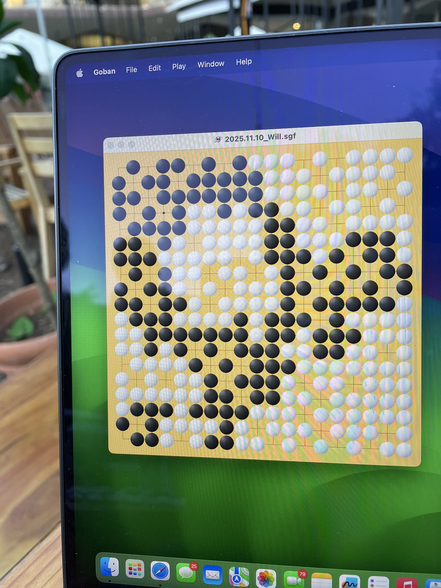 Once we finished, Scott reported: this program is much stronger than Scott. (Who, himself, is significantly stronger as a human player than Will is.) Scott played against his own program. He beat it once with a 6 stone handicap, and never with only a 5 stone handicap. But that was a version of the program that was only given 1 second to make moves! In this match, the program got 30 seconds to make moves.