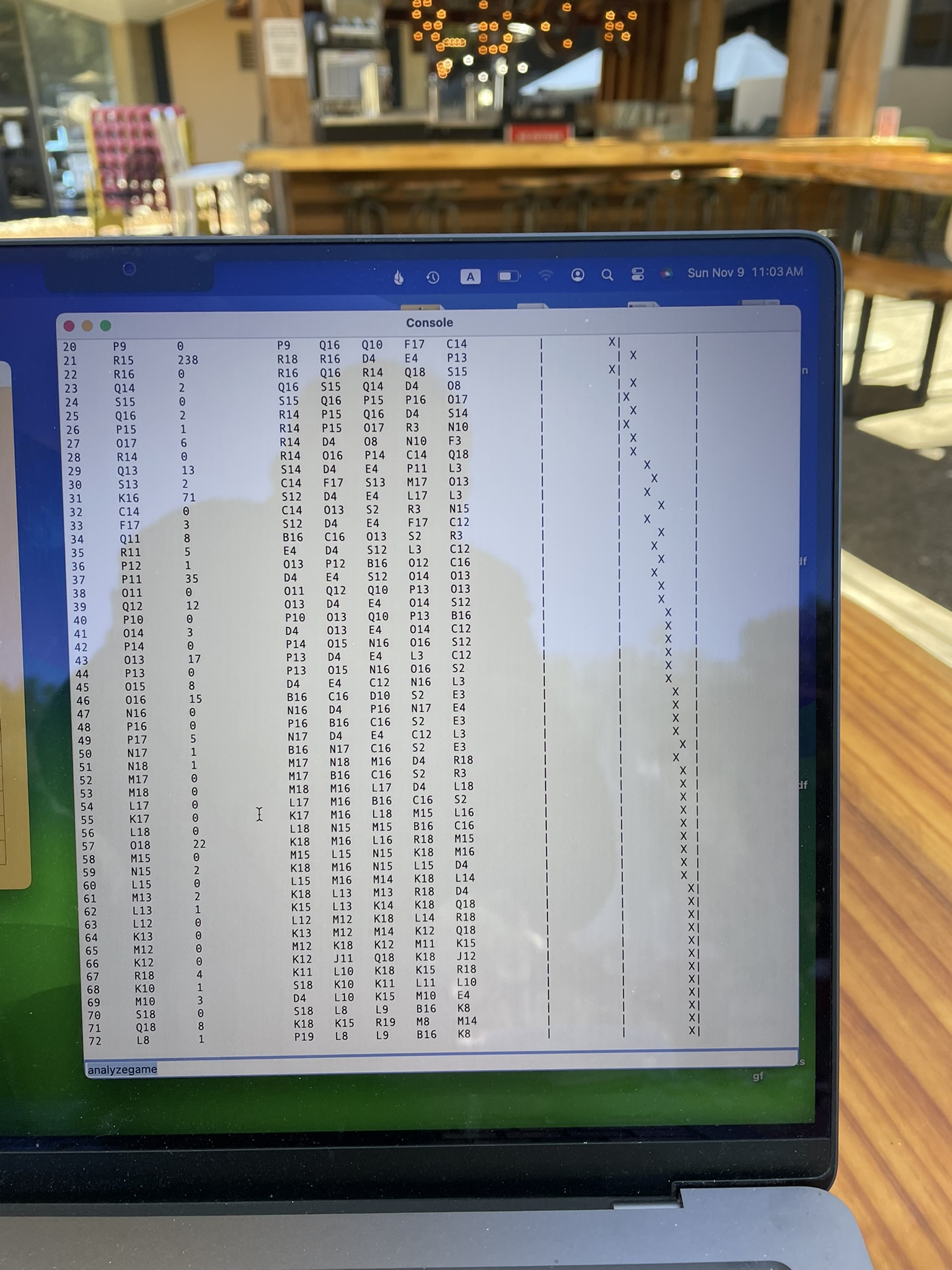 Scott: "Sadly, my program is no better. But not for lack of trying. I did build a simple stochastic player. Unfortunately, it was worse than my previous program." Scott's program passed, halfway through the game.